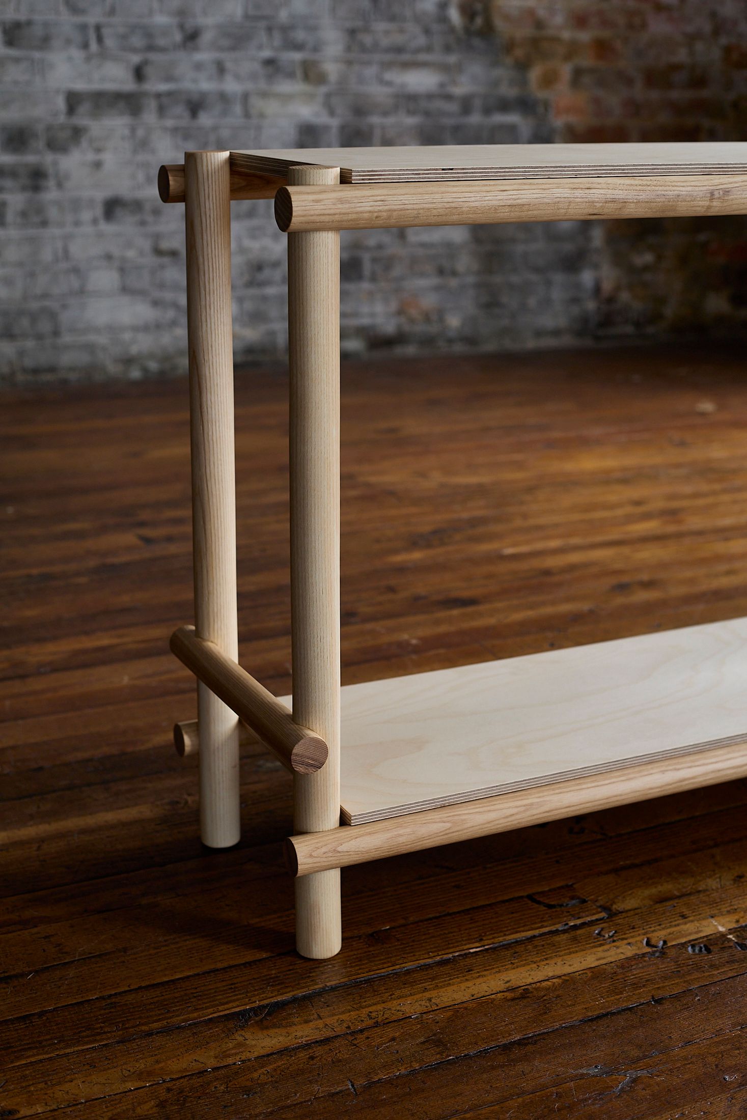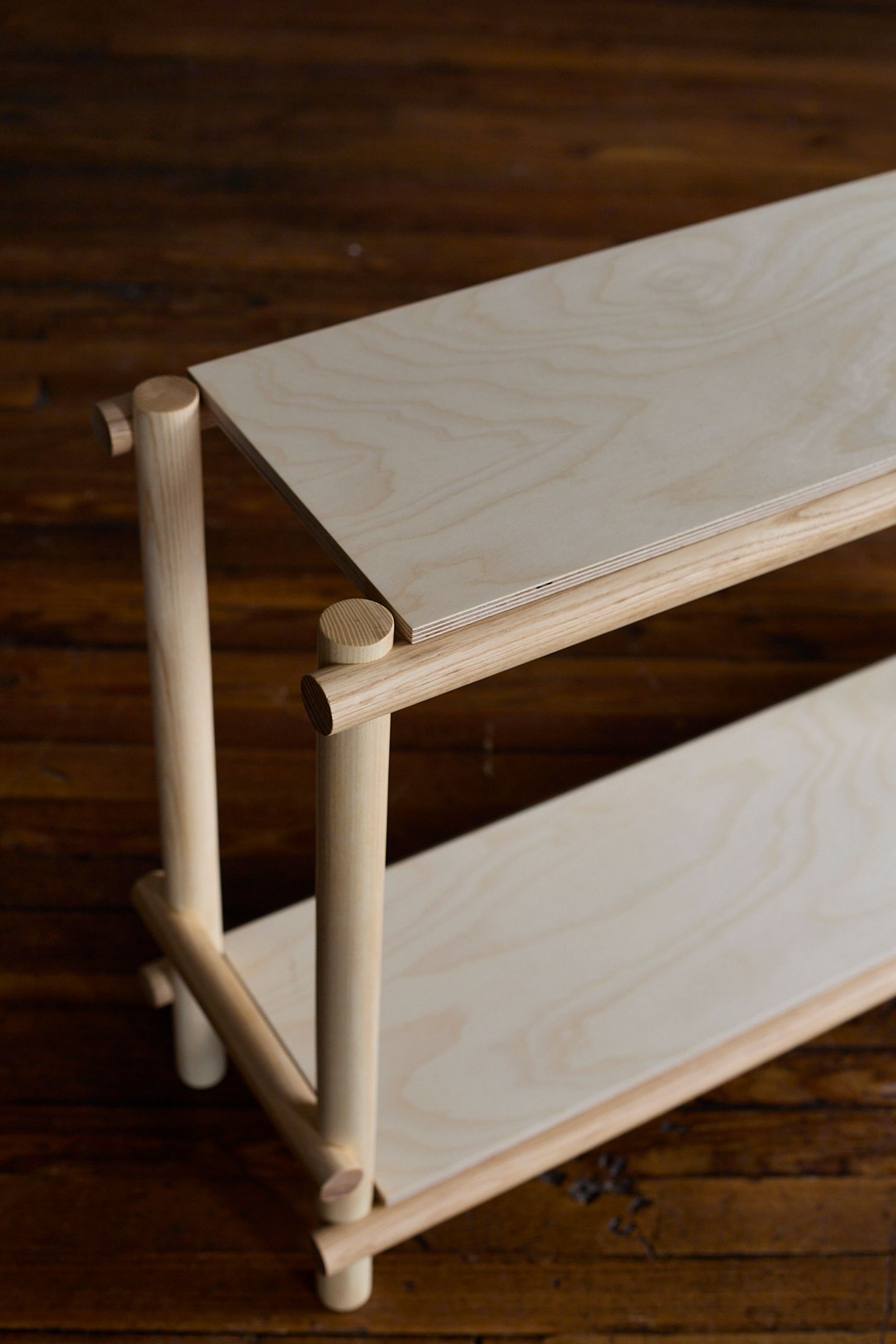 Siginiture half-lap dowel joinery and plywood shelves make up this unit. Ash, Birch plywood. 24"h 12"d 40"w