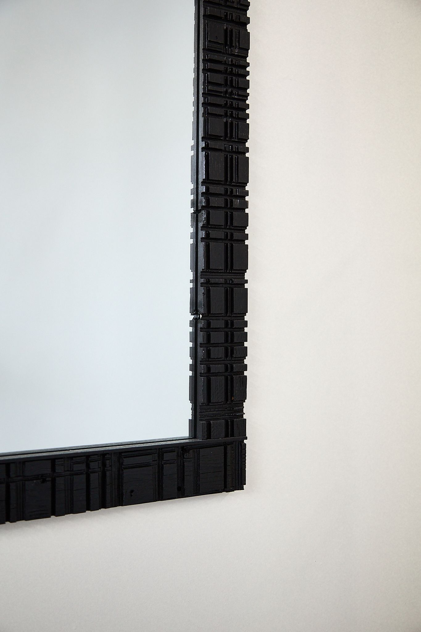 Made from sacrificial boards, harvested at my beloved Limestone Quarry. The kerfs are cut by the stonecutters as they mill blocks into custom sizes. Each is unique, and represents a collaboration between Newins and a handful of unknown quarry workers. Ash, India Ink, Pine, Mirror 42"x32"